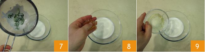 to retain the leaves and obtain only a liquid mixture 7. Drain the gelatin and add it to the cream 8, then also add the grated cheese 9.