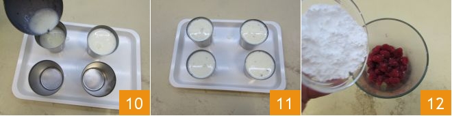 Using a ladle, transfer the mixture into the 4 molds 10, with a capacity of 5.6 oz each. Let them cool first at room temperature 11 and then in the refrigerator to set for at least 5 hours. Before serving the panna cotta, prepare the coulis. Pour the raspberries into a high-sided container, along with the lemon juice and the powdered sugar 12.