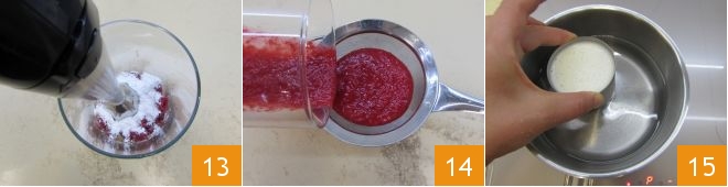 Blend with an immersion blender 13 until you get a puree. Then strain the mixture 14 and set your coulis aside. When ready to serve the panna cotta, immerse the mold in boiling water for a few seconds 15