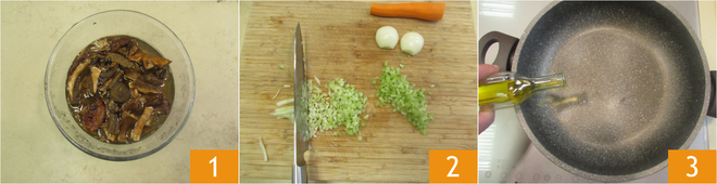 To prepare the pappardelle with lentil and mushroom ragout, first, rinse the dried mushrooms, then soak them in cold water 1 for at least 10-15 minutes, just enough time to prepare the rest. Now, take care of the lentil ragout: clean the carrot, celery, and onion, then chop them finely 2. Pour the extra-virgin olive oil into a saucepan 3.