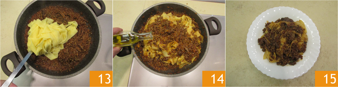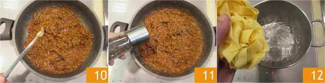 Only when the ragout is cooked, remove the garlic 10 and adjust the salt and pepper 11. Cook the pappardelle 12 in boiling salted water.