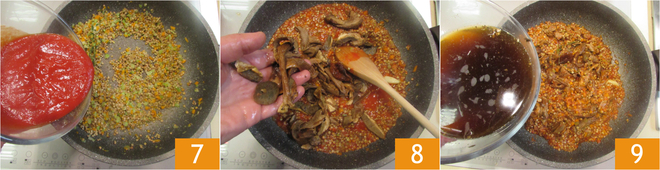 Mix everything and add the tomato puree 7. Add the already soaked and drained mushrooms 8, also pour in 100 g of soaking water after filtering it through a cheesecloth to remove impurities 9, and mix again. Let it cook for about 40 minutes. Cooking times may vary depending on the type of lentils you purchase, so we recommend reading the instructions on the package and following them.