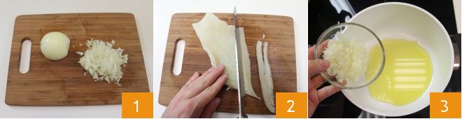 To prepare Parmesan-style tripe, finely chop the onion 2 and cut the tripe into strips 2. In a tall and large pot, sauté the onion with extra virgin olive oil 3 and