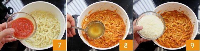 add the tomato sauce 7. Mix everything together and stir with a wooden spoon, then let it cook uncovered over low heat for about 2 hours, occasionally adding a ladle of beef broth 8 to prevent the tripe from drying out and to keep it tender. Once cooked, add the grated Parmigiano Reggiano 9, mix well, and serve your Parmesan-style tripe.