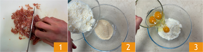 To prepare the passatelli with prosciutto in meat broth, first make the meat broth following our recipe. In the meantime, prepare the passatelli: take 4 slices of prosciutto from the total and set them aside, then finely chop the rest 1. In a bowl, pour the breadcrumbs, grated Parmesan 2, and eggs 3.