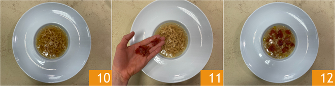 Plate the dish 10 and top with coarsely chopped crispy prosciutto 11. Your passatelli with prosciutto in meat broth are ready to be served 12!