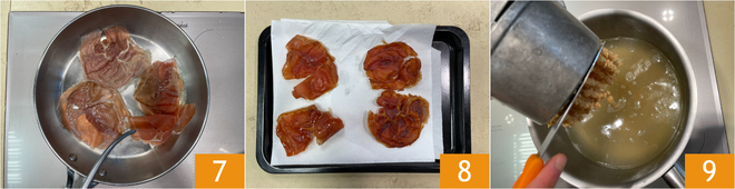Meanwhile, place the reserved slices of prosciutto in a hot non-stick pan 7 and cook over medium heat for 3-4 minutes per side until crispy. Transfer the crispy prosciutto to absorbent paper 8 and bring the broth back to a boil. Place the dough into the appropriate tool (alternatively, you can use a potato ricer with large holes) and press it directly into the boiling broth, cutting the passatelli with a knife blade to a length of about 1.5 inches 9. Cook for 2-3 minutes or until they float to the surface.