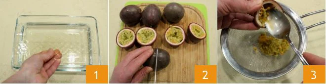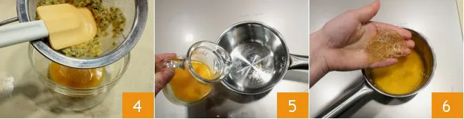 Use a spatula to extract the juice by pressing the seeds well 4, then pour it into a small saucepan. Heat it slightly, then add the well-squeezed gelatin sheets 6.