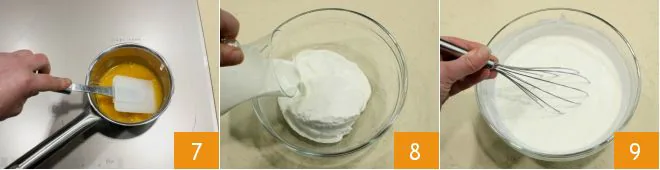 Stir to completely dissolve the gelatin 7 and set aside. Meanwhile, in a small bowl, add the sifted ricotta and the fresh liquid cream 8; mix the two ingredients with a hand whisk 9.