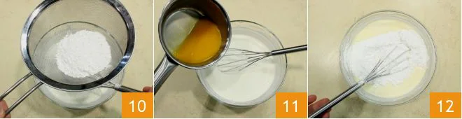 Sift the powdered sugar into the bowl as well 10 and once it is incorporated, pour in the juice in which you dissolved the gelatin 11. Combine everything with the hand whisk 12.
