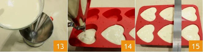 Pour the mixture into a small funnel 13 to fill the heart-shaped silicone molds more easily 14 (alternatively use a spoon); then level the surface of the molds with a spatula 15. Let the mold rest in the refrigerator for 3-4 hours or until fully set.
