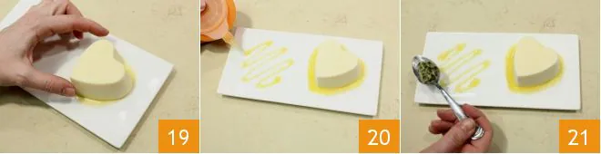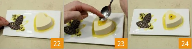 Place the heart on the sauce 19 then let your imagination run wild to decorate the plate with the sauce and passion fruit seeds (20-21).