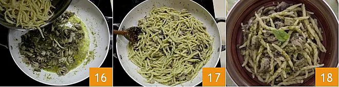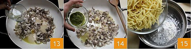 Add the white wine 13. Cook for about 10 minutes, then take the pesto that you had set aside and dilute it with a bit of hot water. Add it directly to the pan 14 and let the ingredients blend by mixing them together. If necessary, you can add a little more hot water so that the sauce doesn't dry out too much. Meanwhile, bring a large pot of water to a boil, salt it to taste, and bring it to a boil. When the water boils, add the trofie (or another type of pasta will also work) 15 and cook until al dente.