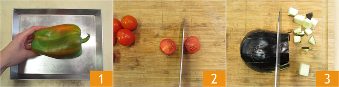 To prepare cucunciata pasta, start with the bell pepper: grill it on a grill plate or in the oven at 450°F for about 20 minutes 1. Meanwhile, prepare the sauce: wash the cherry tomatoes and cut them in half 2, wash and cut the eggplant into 1/2-inch cubes 3.