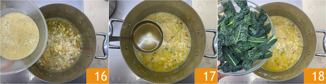 Pour the obtained purée back into the pot 16, add more broth 17, and the cabbage leaves 18.