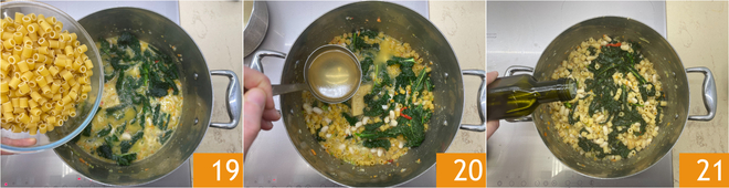 Now add the pasta 19 and cook, adding broth 20 as needed 20. Finally, stir in a drizzle of oil 21.