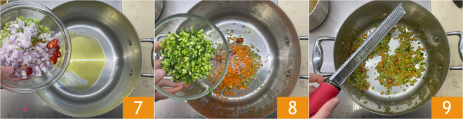 Prepare the classic sauté with oil, chopped vegetables, chili pepper 7, and black cabbage stems 7. Sauté and add chopped rosemary and grated garlic 9.