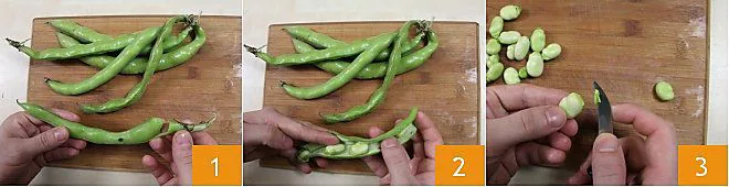 To prepare pasta and broad beans, start with the pods of fresh broad beans: open them by breaking the top stem 1, then shell the beans with your hands 2. Once extracted, remove the small growth on the side of each one 3.