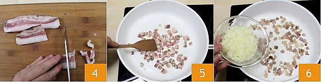 Cut the pork cheek into cubes 4 and place it, without any seasoning, in a non-stick pan to brown over low heat until the fat melts and the pork cheek is golden 5. Clean and chop a large onion and add it to the pan along with the pork cheek 6;
