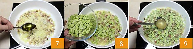 also add 4 tablespoons of extra virgin olive oil and let the onion turn golden 7. At this point, add the shelled broad beans 8, stir. After a few minutes, add a couple of ladles of broth 9 and let it cook over low heat for about 20-25 minutes (it might take a few more minutes depending on the size of the broad beans),