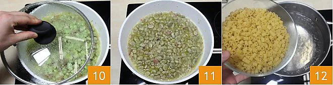covering the pan with a lid 10 and leaving a small vent. During cooking, add vegetable broth whenever needed until the broad beans are cooked; adjust salt and pepper, then stir and turn off the heat 11. Boil the ditali rigati in plenty of salted boiling water 12 and, halfway through cooking, drain them, keeping some of their cooking water aside.
