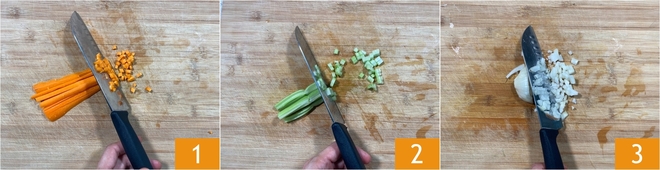 To make the pasta and potato supplì, first prepare the vegetable broth and keep it warm. Start with the vegetables for the soffritto: clean and cut the carrots 1, celery 2, and onion 3 into 3/8 inch dice.