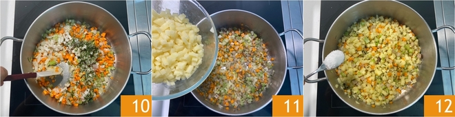 Sauté over medium-high heat for 5 minutes, stirring often 10. At this point, add the potatoes 11 and salt 12.