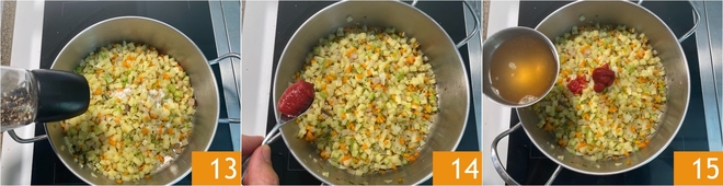 Season with black pepper 13 and tomato paste 14, then cover everything with a portion of the vegetable broth 15.