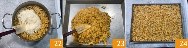 Mix well 22, then transfer the pasta and potatoes to a baking sheet 34, spreading it across the surface 34. Place the tray in the refrigerator.