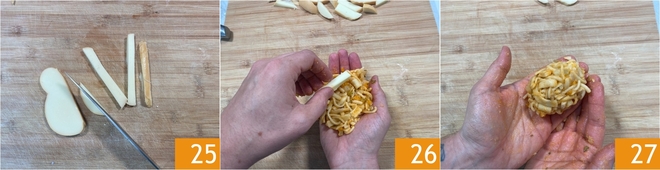 Meanwhile, cut the scamorza into strips 25. After the cooling time, wet your hands and take a portion of pasta and potatoes, lightly pressing it in the palm, then add the scamorza 26 and seal it inside to form supplì 27; with these quantities, you should get about 20.