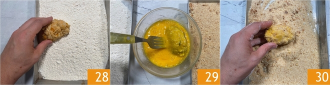 After forming all the supplì, you're ready for the breading: coat the supplì first in flour 28, then in beaten eggs 29, and finally in the mix of fine and rustic breadcrumbs 30.