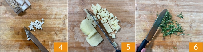 Dice the lard as well 4. Peel the potatoes and cut them into the same-sized cubes 5. Finally, finely chop the rosemary 6.
