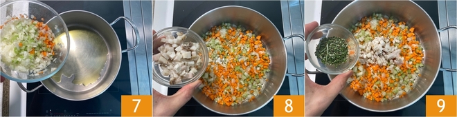Heat the oil in a large saucepan, then add the chopped vegetables 7, lard 8, and rosemary 9.