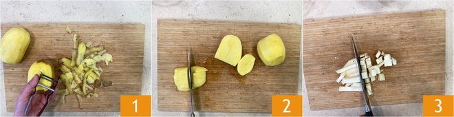 To prepare pasta and potatoes alla tiella, first wash and peel the potatoes 1, then cut them into large pieces about an inch 2. Now take the caciocavallo cheese, remove the outer part, and cut it into cubes 3.