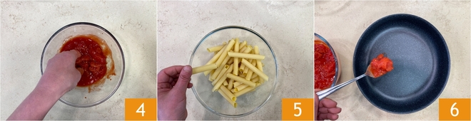 Pour the peeled tomatoes into a bowl 4 and crush them with your hands. Try to break them up as much as possible to get a well-seasoned dish. Take the pasta, we used long candles, and break them into 3-4 parts with your hands. Now take a round baking dish with a 10-inch diameter. Place some of the tomatoes at the bottom 6.