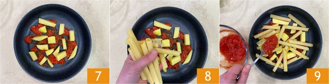 Add some potatoes 7 and create the first layer of pasta 8. Add more tomato 9.