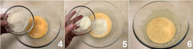 Add the grated pecorino to the eggs 4, mix and finally add the grated parmesan 5. You will obtain a light and thick mixture 6.