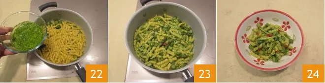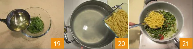 Thin the arugula pesto with the asparagus cooking water 19 to make it creamier. At this point, cook the pasta in salted boiling water 20 and drain it al dente. Add the pasta to the pan with the asparagus 21 and sauté for a minute.