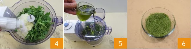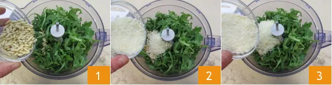 and salt it 4. At this point, add a small portion of the olive oil 5, start blending everything at low speed and gradually add the remaining olive oil in a thin stream until you get a well-blended and smooth cream. Once ready, set the arugula pesto aside in a bowl 6.