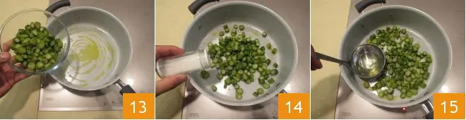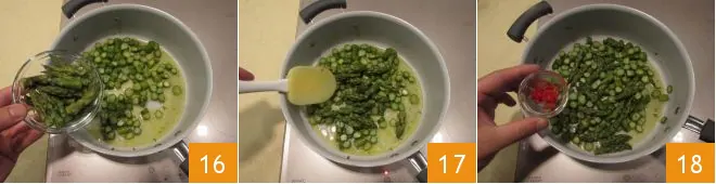 Sauté the cleaned asparagus stems in a pan with the butter for about 5 minutes 13; then salt 14 and pepper and add a bit of the asparagus cooking water 15 to make the cooking more even.