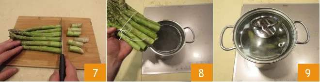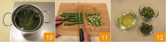 Now focus on the asparagus: wash them and cut off the tough part with a knife 7 (if they are too hard, you can peel them with a potato peeler or a knife to remove the fibrous part), then tie them in a bundle with a string 8 and cook them in the asparagus steamer 9 for at least 10-15 minutes, starting from cold water.