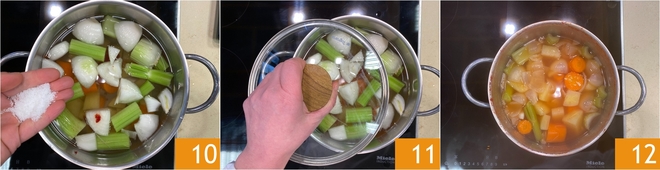 Season with salt 10, then turn on the heat to medium, cover with a lid 11, and let it gently boil for about 30 minutes, until the vegetables are soft 12.