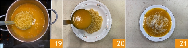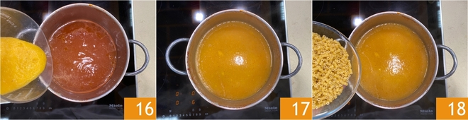 Pour the vegetable cream back into the broth 16 and heat it until it comes to a boil again. Then add the small pasta 18.