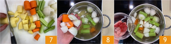 Rinse the vegetables under running water and cut the onion 4, celery 5, and carrot 6 into coarse pieces.