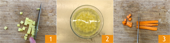 To prepare the pasta, potato, and pea soup, peel the potatoes and cut them into 1/2-inch cubes 1. Place them in a bowl covered with water to prevent them from browning 2. Peel, trim, and cut the carrots into cubes of about 1/2-inch 3.