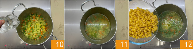 Add water until it covers the ingredients, preferably hot but cold will also work 10, and let simmer for 15 minutes 11. Add the pasta 12 and add more water if needed.