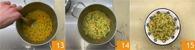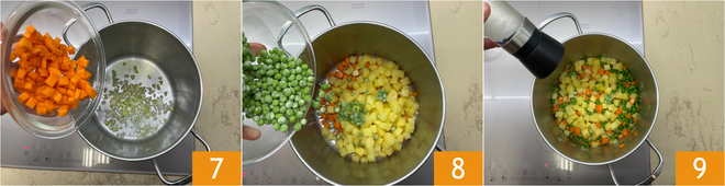 Add the onion, carrots 7, potatoes, and peas 8. Salt 9 and let flavor for 4-5 minutes over high heat, stirring continuously.