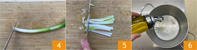 Trim the green onion 4, cut off the green part and remove the outer leaves from the lighter part, then chop it finely 5. Heat some oil in a pot 6.