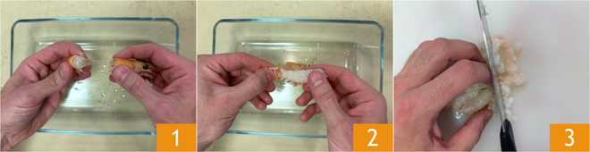 To prepare pasta with potatoes and scampi, first make the Vegetable broth following our recipe and keep it warm. Proceed to How to clean shrimp: remove the head 1, eliminate the shell 2 and the vein, then finely chop the flesh 3. Transfer them to a bowl and let them rest in the refrigerator until needed.