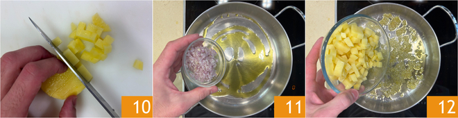 Peel the potatoes and cut them first into slices, then into sticks, and finally into small cubes 10. In a pot, heat a drizzle of oil, add the shallot 11, and sauté for a few minutes. Add the potatoes 12.